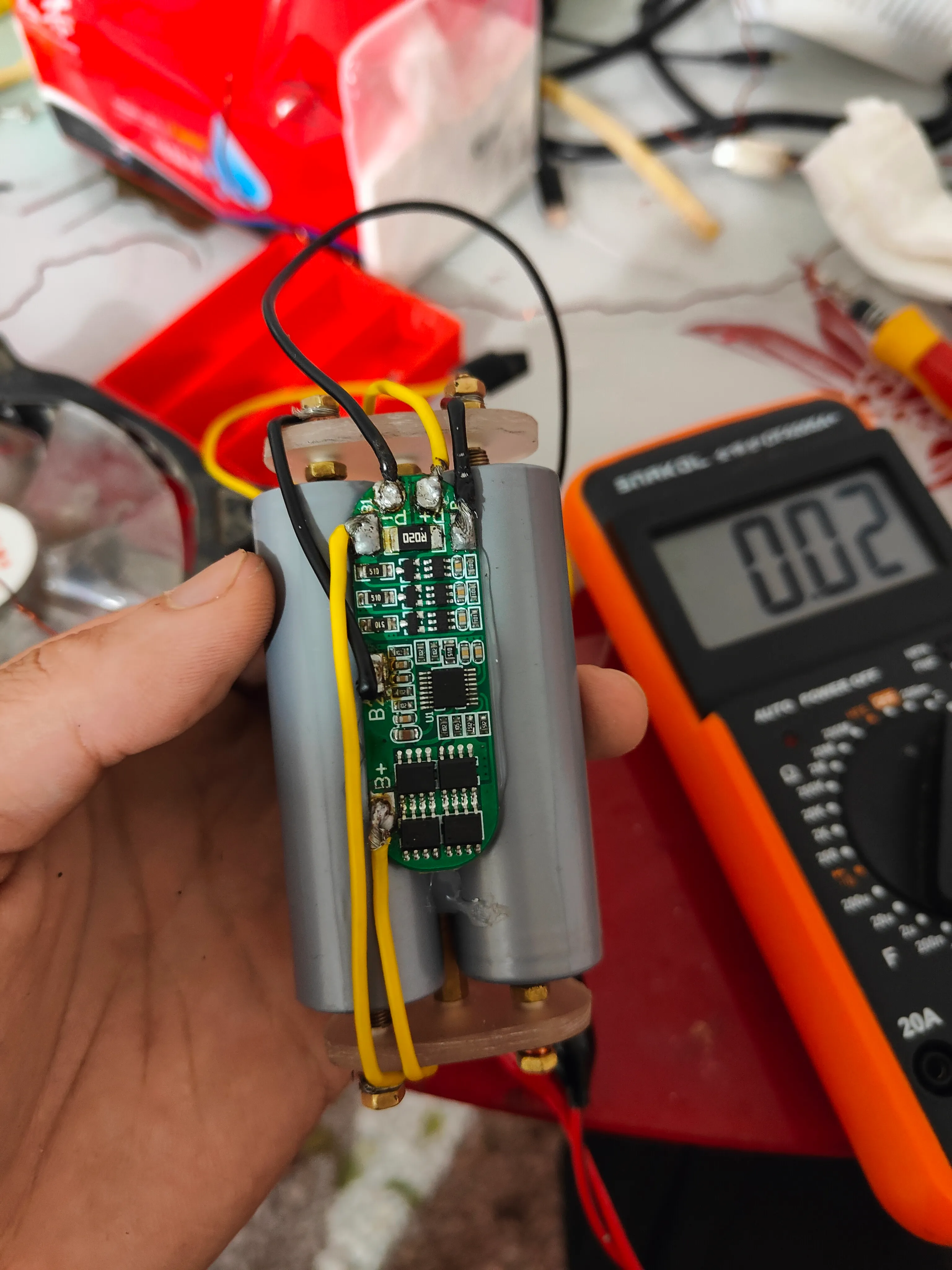 电池在这里的作用是储存电能,当停电的时候由电池给nas供电,在这里我用了3颗21700电池进行串联,单颗电池容量18.5wh 18.5*3=55.5,也就是说能够支持55.5w的电器使用一个小时,由于没有点焊机,所以我自己用亚克力板做了一个电池盒,将电池串联起来。