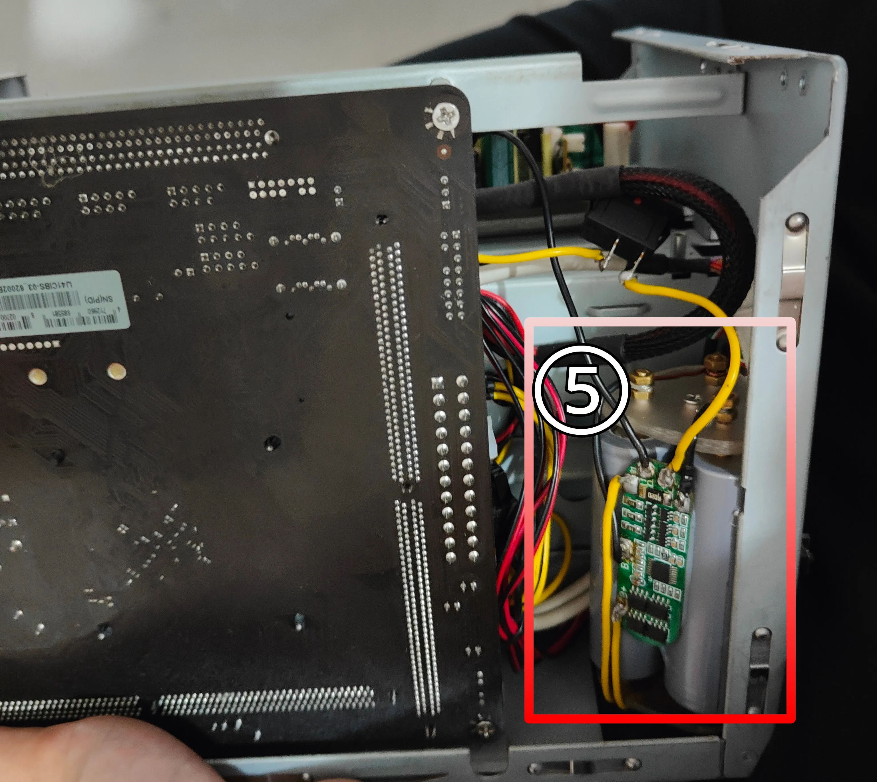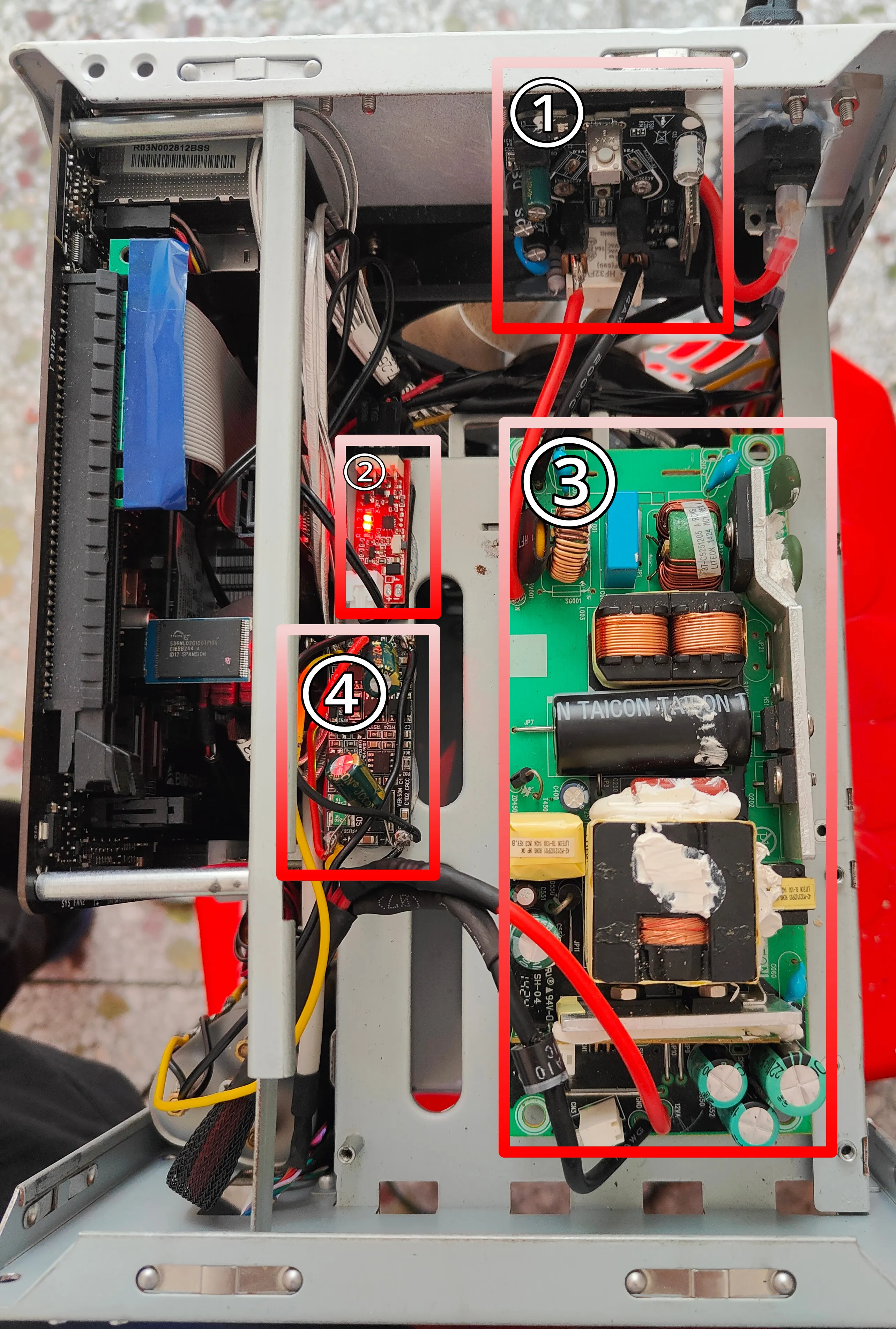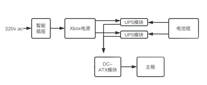 方框里的元器件分别是: ①拆除了外壳的小米智能插座3 ②风扇调速模块;电源在运行的时候温度是很烫的,所以我加装了一个风扇给电源降温,模块带温控功能,能根据机箱环境温度进行调节转速速或者停止工作。 ③拆除了外壳的xbox电源。 ④两块并联的UPS模块。 ⑤电池组