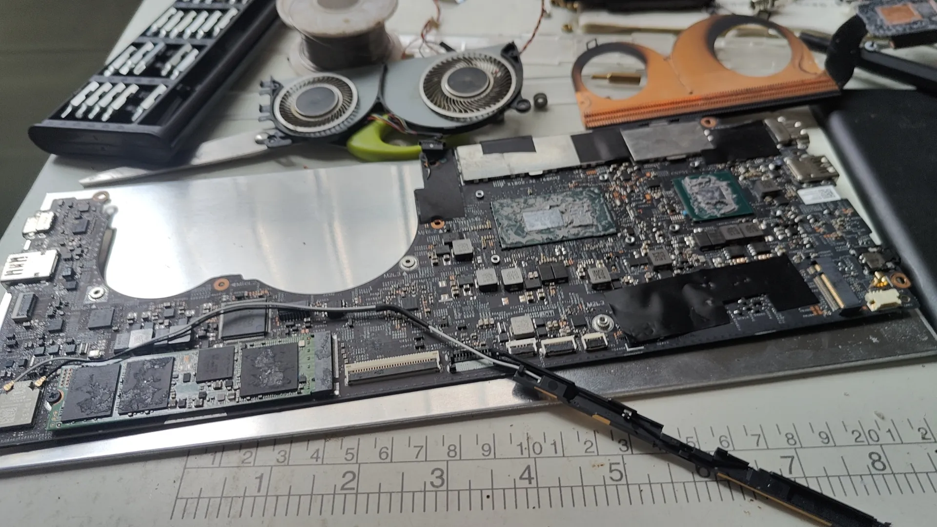 第一步是拆解主板。拆开笔记本外壳,取出主板后,用尺子一点点测量关键尺寸:主板长宽、接口位置。这些数据将直接决定机箱的兼容性。